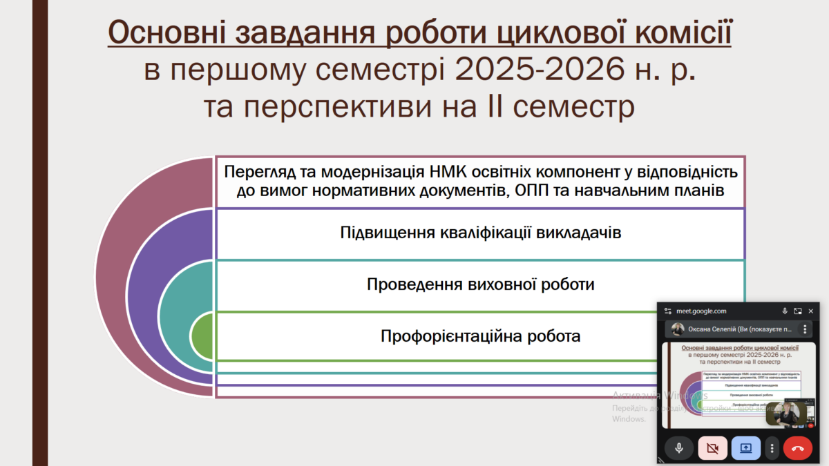 Засідання пройшло у форматі конструктивного діалогу. Голова комісії Оксана Дмитрівна Селепій підкреслила, що злагоджена робота колективу є запорукою якісної підготовки фахівців, готових до викликів сучасної освіти.
