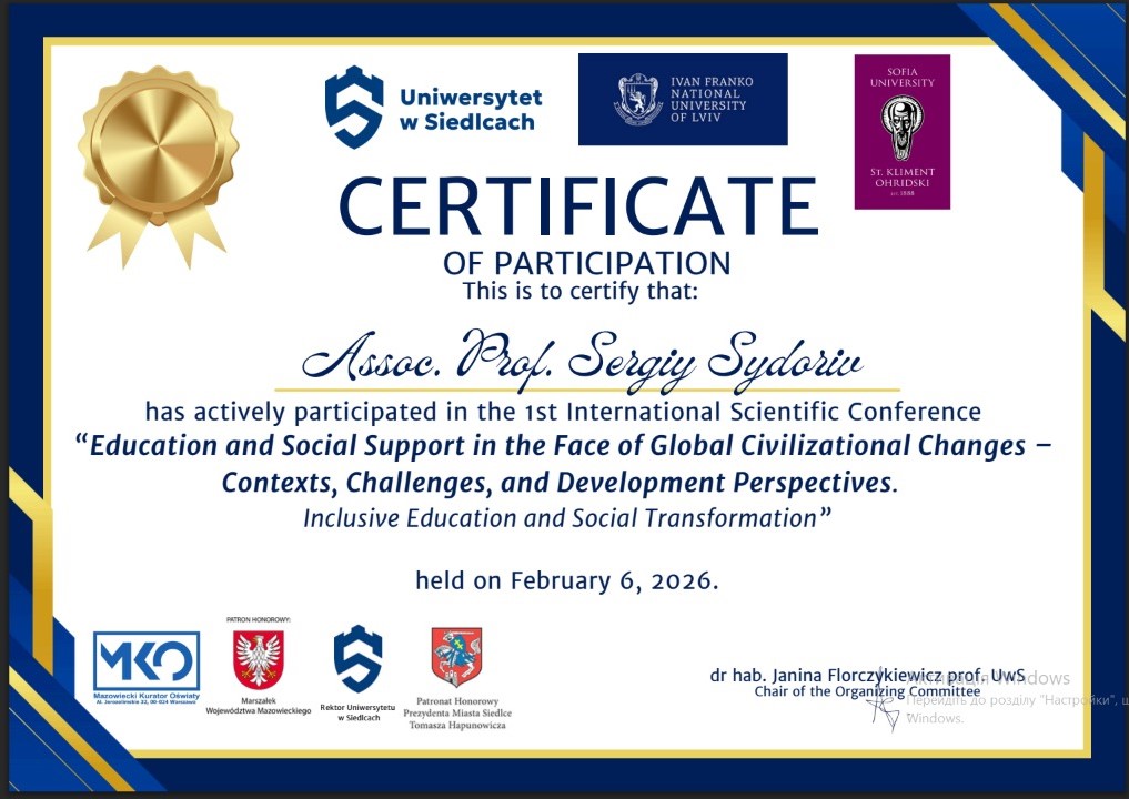 Serhiy Sydoriv delivered a report titled: “Educational and Social Projects as a Catalyst for Professional Motivation and Inclusive Culture of Future Educators in a Sustainable and Decolonized Educational Space.” The conference served as a powerful platform for discussing the future of education amidst global civilizational shifts. The event was co-organized by leading European higher education institutions: University of Siedlce (Poland); Ivan Franko National University of Lviv (Ukraine); Sofia University “St. Kliment Ohridski” (Bulgaria).